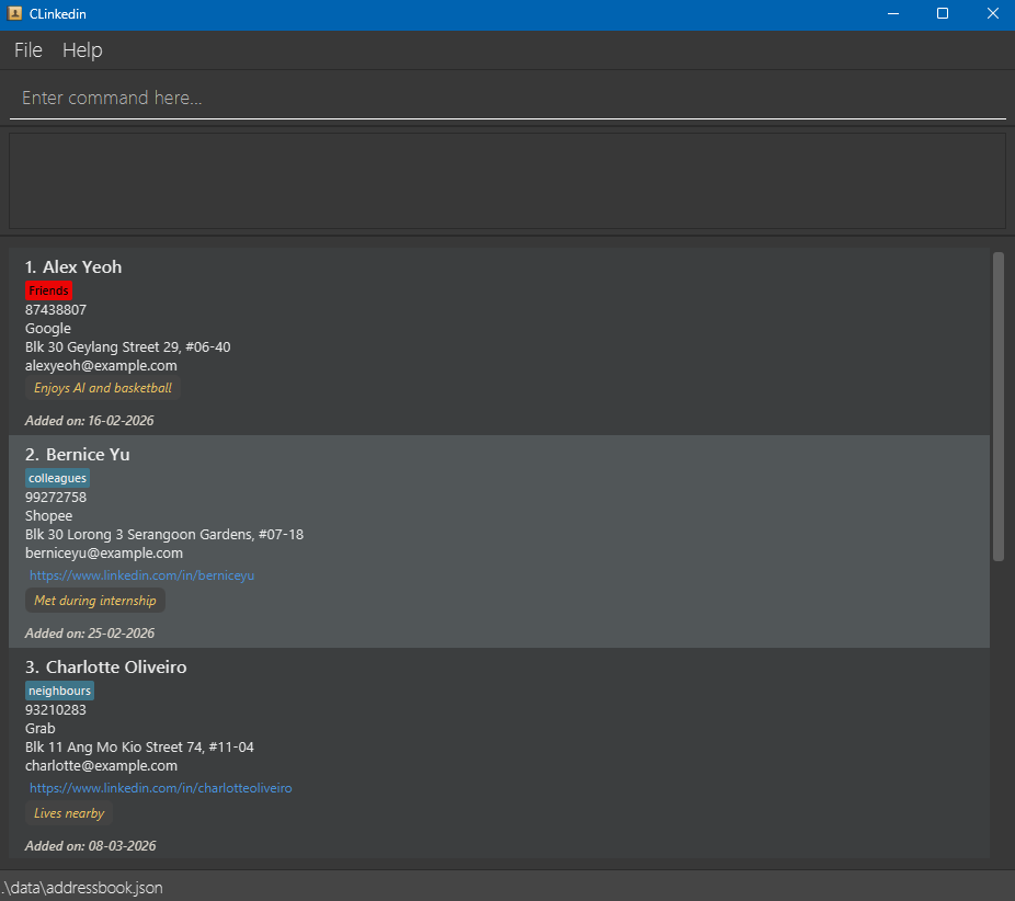 CLinkedin is a desktop application for managing your contact, optimized for use via a Command Line Interface (CLI). While it has a GUI, most of the user interactions happen using a CLI (Command Line Interface). If you can type fast, CLinkedin can get your contact management tasks done faster than traditional GUI apps.